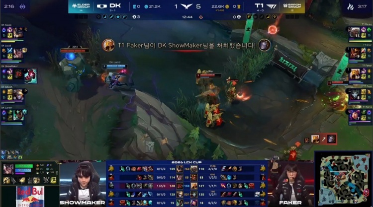 中期双方围绕先锋与小龙多次交换人头,Faker沙皇与Doran安蓓萨联动在上路击杀Siwoo兰博,T1保持2.7k优势,DK借先锋追回部分经济。