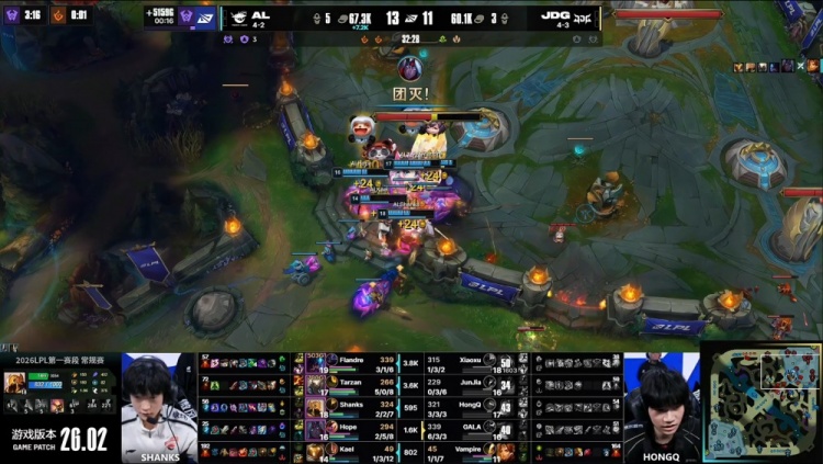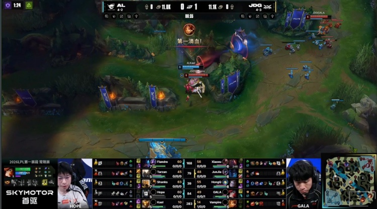 中期小龙团王杰韦鲁斯又被GALA点掉,Flandre雷克塞难逃一死,JDG推掉AL中路二塔,经济领先3k;后续Tarzan潘森大招进场开团,AL击杀JunJia梦魇与Xiaoxu赛恩扳回前期经济劣势,双方经济持平。