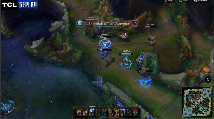 【24:45】下路团战,Tarzan石头人撞飞Junjia,V神牛头绕后进场开团,徐神鳄鱼终结Tarzan石头人,HongQ带队出击逮捕shanks冰鸟,JDG团灭AL,经济领先3.6k。