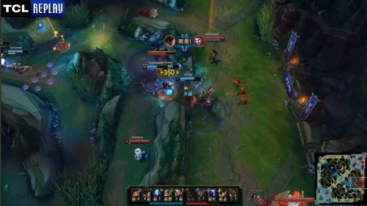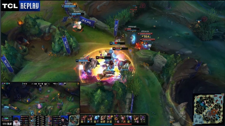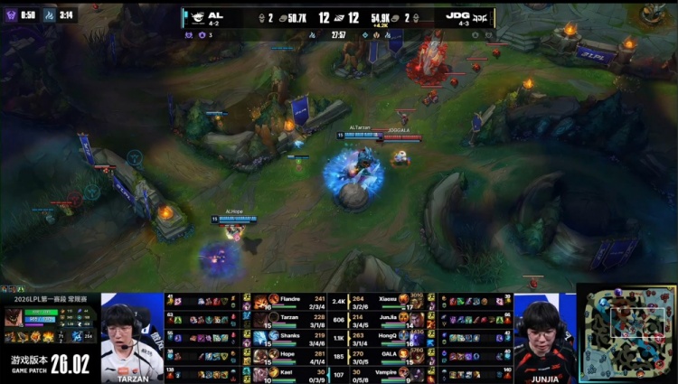 中期小龙争夺中Tarzan石头人反手撞飞JDG两人,Hope飞机收下双杀,随后AL先拿大龙并打出1换2,中路GALA吉格斯回程,盲视野极限闪现躲开Tarzan石头人隔墙大招。