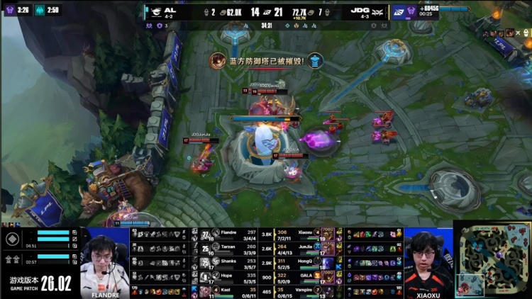 后期,JDG拿到风龙魂并控下大龙,正面团战Xiaoxu鳄鱼咬穿AL下路双人组,JDG推平AL基地扳回一城。
