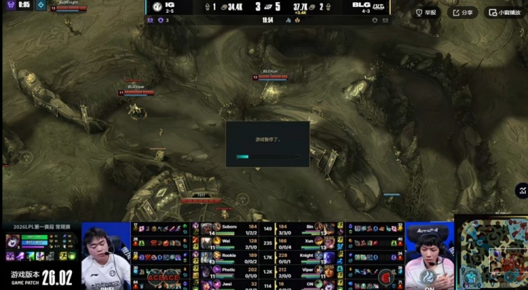 【19:50】比赛进入暂停!(Wei潘森捡不到红BUFF的BUG),随后裁判组认定回溯比赛约20秒!