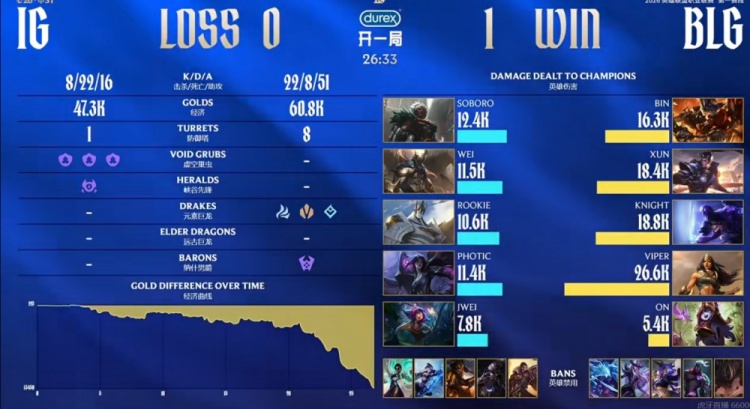 首局比赛Bin兰博上路对位线杀Soboro安蓓萨拿下一血,下路打出对线压制拿到小龙主动权!中期iG连续强杀Bin兰博但是没人管的knight瑞兹和Viper希维尔在中下两路疯狂发育!第三条小龙团iG强杀Viper希维尔但是后续团战没了战力被BLG打出1换3扩大优势!劣势局面iG强开大龙,BLG下路组倒下但是Wei潘森被击杀,BLG上中野打扫战场完成团灭!随后iG下路强杀knight瑞兹被他金身拖够了时间,Viper希维尔拉满输出,BLG再度团灭iG结束比赛!