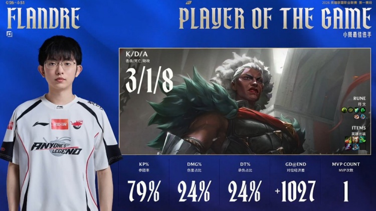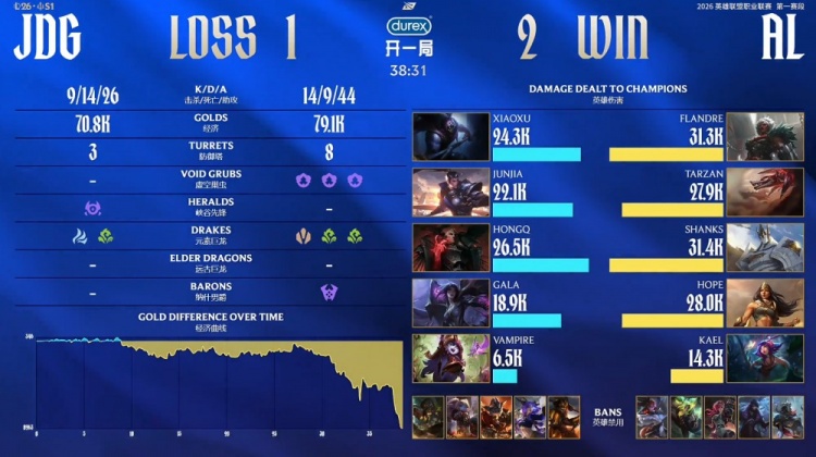 后期AL中路推进,Shanks加里奥配合Kael妮蔻双开团,GALA卡莎进场击杀Shanks后被秒,双方3换3。最终Flandre安蓓萨游龙,AL团灭JDG,一波推平JDG基地拿到比赛胜利。
