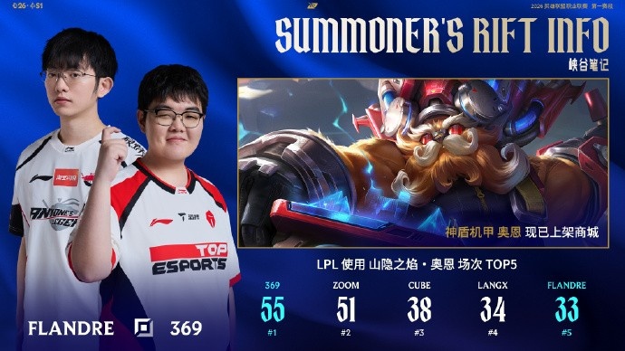 在历史LPL选手使用奥恩场次TOP5中,369 位居第一,Flandre位居第五;