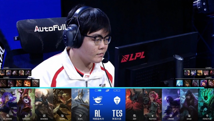 第二局前期下路2v2,Kael璐璐力保王杰芸阿娜拿到JiaQi厄斐琉斯一血,紧接着Kael教科书璐璐联手王杰爆杀TES下路双人组,JiaQi战绩一路来到0-5,TES下路完全炸线,17分钟AL经济领先7k,比赛早早失去悬念。