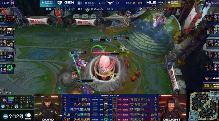 【14:38】小龙团GEN拿下小龙,HLE前排的Delight牛头先被集火强杀!残局Zeus兰博大招+火烤进场面对三个残血仅仅击杀了Duro锤石,自己还吃了Chovy蛇女控制被换掉了啊!HLE随后拿下先锋!本局炼金龙魂!