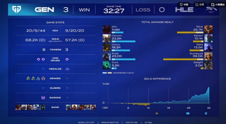 决胜远古龙刷新前GEN上野双大开团强杀Kanavi巨魔,HLE不得不看,Zeus兰博撒大+冲锋吃到锤石钩子没了啊!Ruler厄斐琉斯无情打扫战场送别徐进赫,GEN再次团灭HLE结束比赛!这样GEN确保组内头名的同时,HLE因为战绩垫底被直接淘汰出局!无缘LCK杯后续比赛!放假到四月!