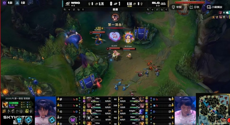 直播吧2月2日讯 2026年LPL第一赛段今天继续,今天的第二场比赛是WBG对阵BLG!