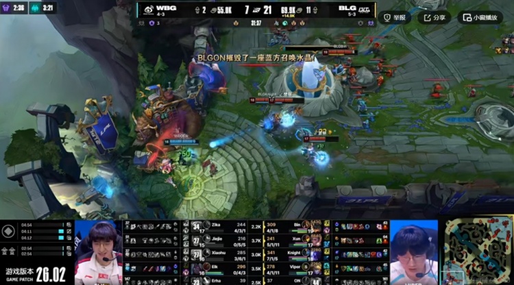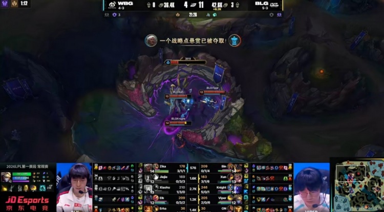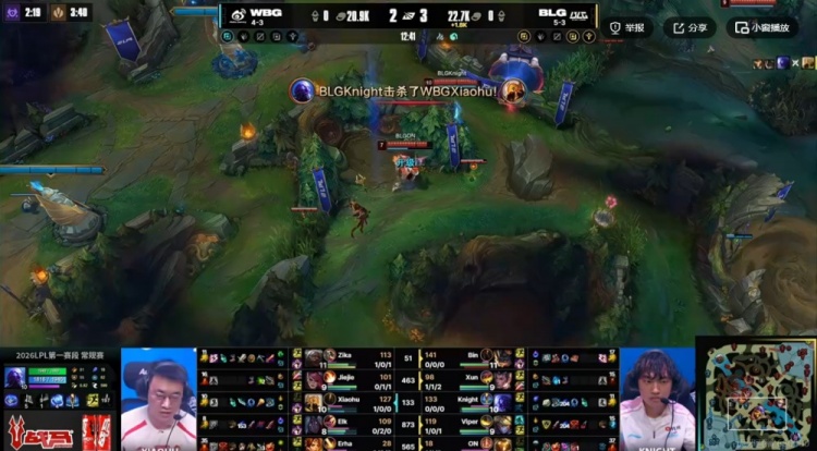 【19:24】下路Xiaohu沙皇开推Bin兰博但是BLG野辅就在旁边啊!双方第一波拉扯Bin没倒,但是第二波BLG五人反打逐个击破!knight瑞兹双杀之后BLG抱团再追击,最终BLG拆下一塔,给WBG打了个2+3的准团灭啊!