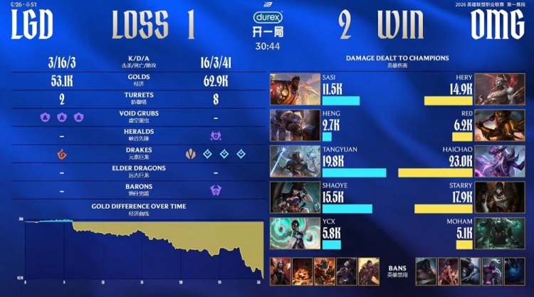 直播吧2月2日讯 2026LPL第一赛段组内赛继续进行,今日首场涅槃组比赛由LGD对阵OMG!