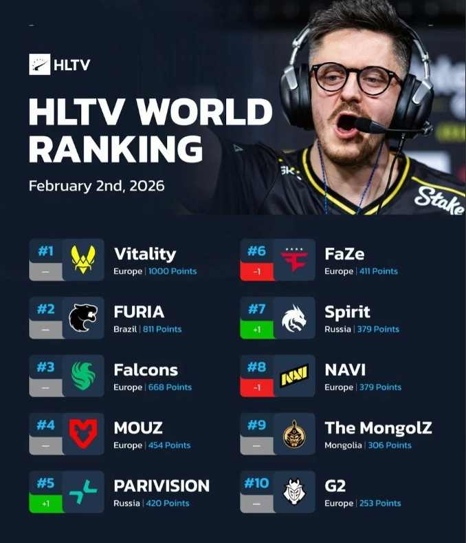 直播吧2月3日讯 根据HLTV官方推特最新发布的CS2战队排名,法国豪门Team Vitality再次达到1000分大关,稳居世界第一宝座。这支由明星选手ZywOo领衔的战队凭借近期在各项赛事中的稳定发挥,成功重返积分巅峰。