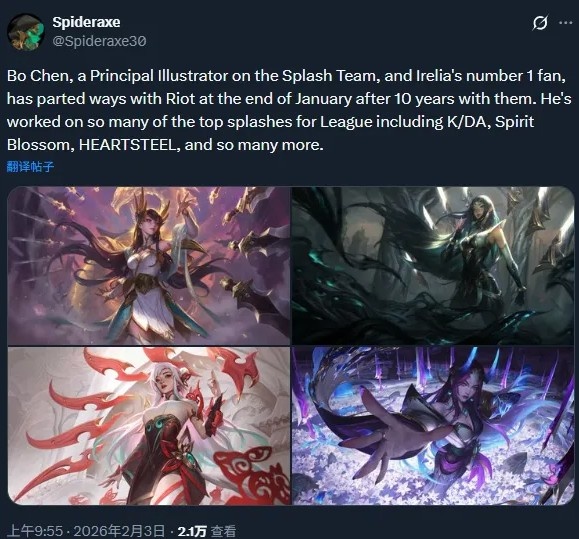 直播吧2月3日讯 X上爆料LOL原画团队首席插画师CHENBO在为拳头工作十年后于1月底离职。包括EDG冠军皮肤、距离最近的新英雄亚恒的原画以及刀妹的玉剑仙、剪纸仙灵等多款皮肤原画都出自他的手笔。