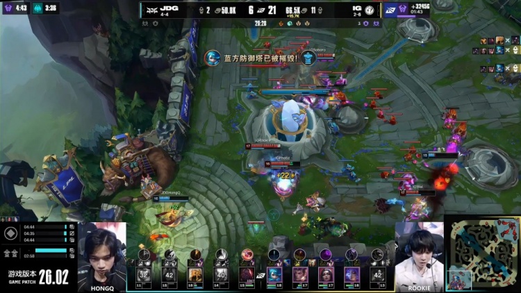 【14:08】小龙团,双方中单见面互换,HongQ沙皇死前一推三,Photic芸阿娜开大爆轰GALA与V神拿到双杀,iG打出1换4推掉JDG下路一塔。iG经济领先2k。