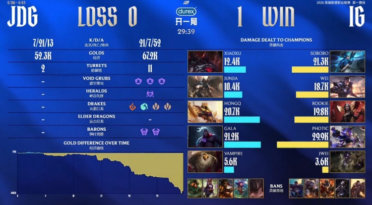 后期Soboro格温发育成型正面一剪五,iG轻松拿到土龙魂融化JDG,最终iG再吃大龙推平JDG基地先下一城。