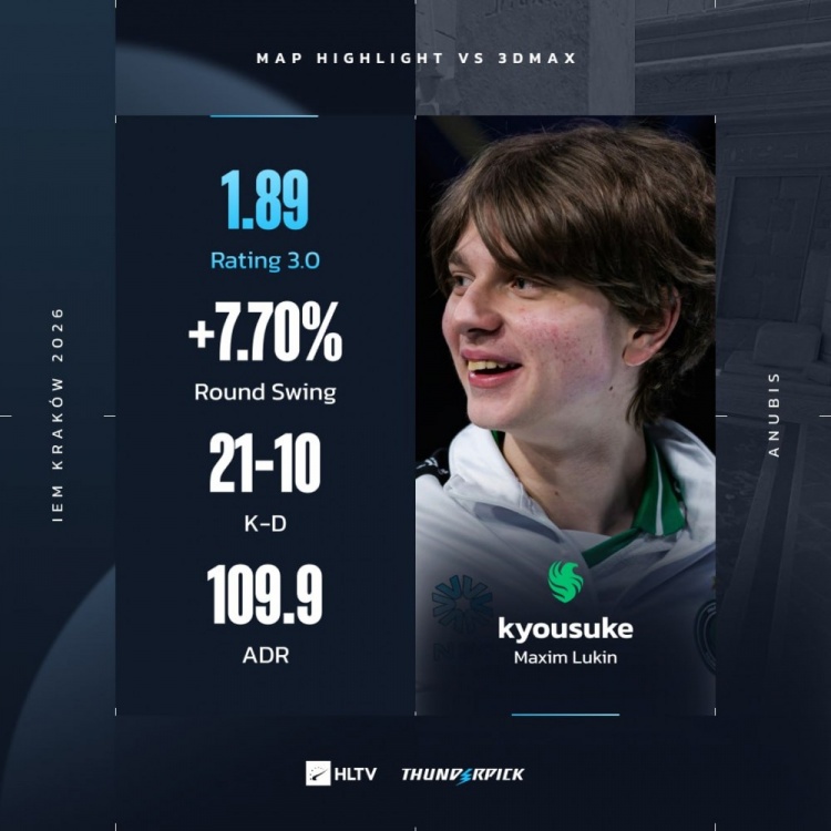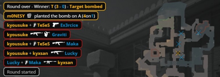 3DMAX先作CT,手枪局猎鹰提速中路夹A拿到首分,次回合3DMAX纯E让出第2分。来到长枪回合,京介配合龙哥闪光爆轰四杀,随后3DMAX枪械不全连送4分。