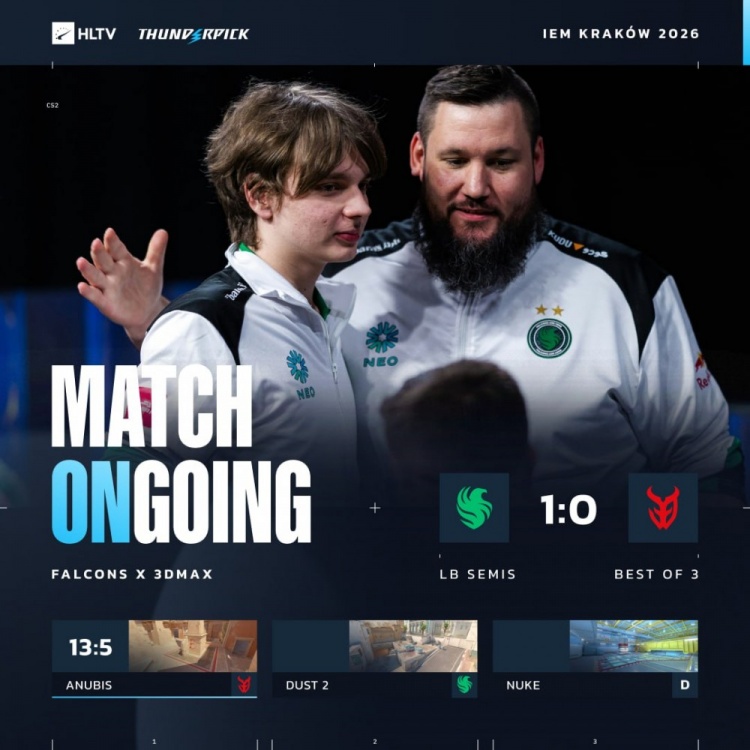 直播吧2月3日讯 CS2大赛IEM克拉科夫败者组半决赛,由Falcons对阵3DMAX!