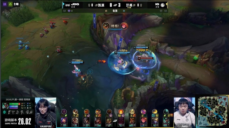 【26:06】中路团战,V神妮蔻开四人,徐神鳄鱼咬掉iG野辅拿到双杀,JDG打出1换3,经济领先3k。