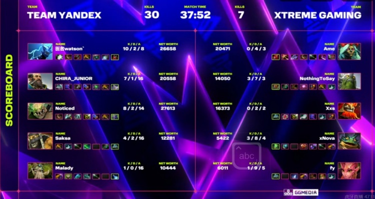 本局比赛XG选出五号位朗戈+一号位奶绿但是线上直接被Noticed孽主针对啊!Maladych大树还来gank了两波让XG优势路对线直接爆炸!中期早早等级领先,出了笛子A杖的Noticed孽主带队扫图扩大优势!XG几次动手但是NTS小小先手根本回不来!Yandex稳步拉开经济差,等到电魂和小Y都出到BKB了大局已定!最终Yandex连续赢团击杀XG众人结束比赛。这样XG战绩来到1-1!