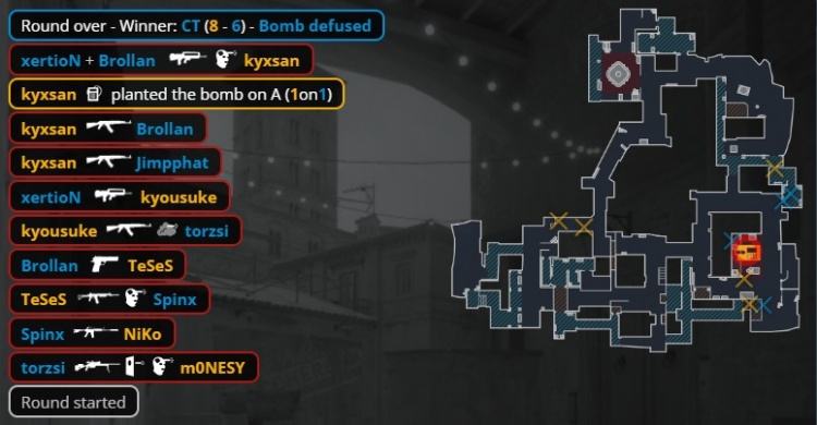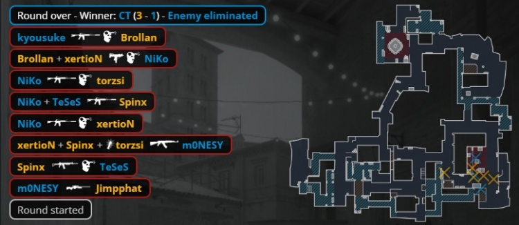 次回合MOUZ强起,torzsi中路鸟狙穿墙爆头Monesy,Spinx架匪口打掉Niko,龙哥飞A二楼换掉小坑Spinx,京介摸书房换掉torzsi,K3残1v3打掉小吉米与Brollan后下包被xertion拉掉,MOUZ拿到第6分。
