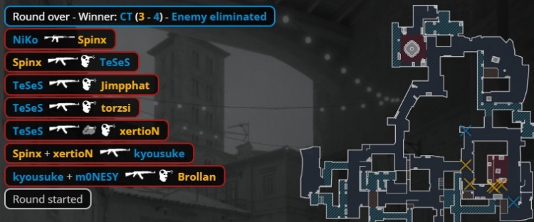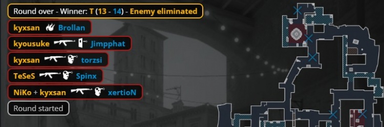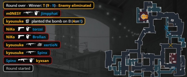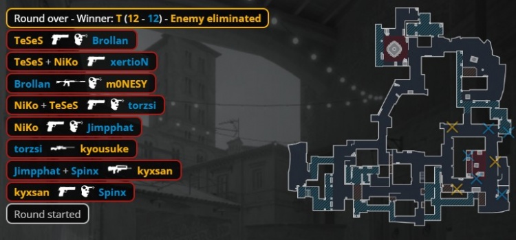 加时赛首回合,猎鹰香蕉道瞬间被杀四人,Niko孤立无援送出人头,MOUZ拿到第13分。次回合Niko独自摸进B点被棺材位xertion打掉,K3被Brollan打掉,龙哥与孩神带包转A被杀,MOUZ拿到第14分。
