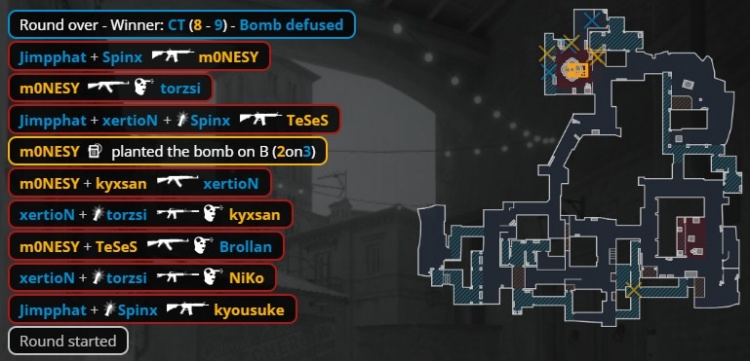 第17回合长枪回合,小吉米出A二楼打掉京介,xertion配合torzsi闪光弹埋伏B死角双杀,孩神反手双杀,小吉米回防双杀后拆包,MOUZ拿到第9分将比分反超。