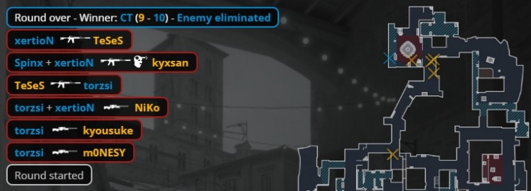 第19回合torzsi香蕉道大狙开场轰掉孩神,Niko捡起孩神大狙,torzsi大狙再架香蕉道打掉京介,死点torzsi大狙再轰Niko,龙哥换掉torzsi后,K3被spinx击杀,MOUZ拿到第10分,zonic喊出暂停。