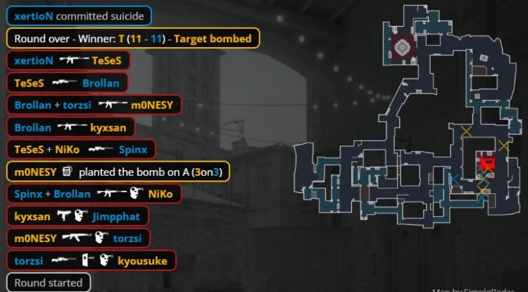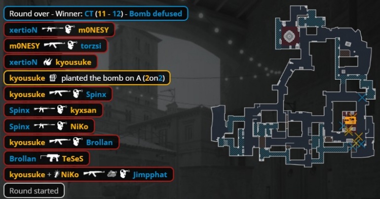 第22回合猎鹰连接夹A,小吉米A包点被杀,正面2换2,孩神在A下包,龙哥捡起torzsi大狙架A1打掉spinx后再杀Brollan,xeriton打掉龙哥但C4爆炸,双方11-11。
