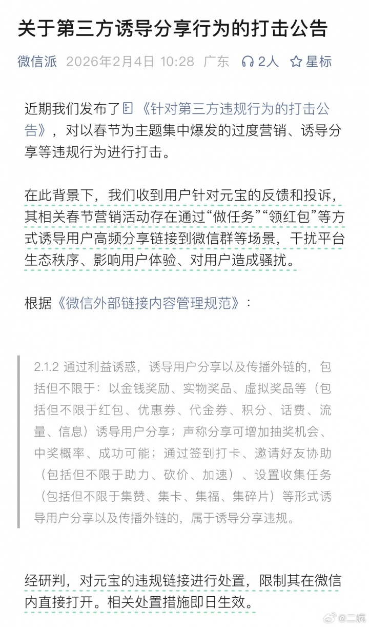 然而今天实测发现,微信目前已在App中屏蔽元宝红包相关链接,并提示:“网页包含诱导分享、关注等诱导行为内容”,要求用户复制到浏览器访问。