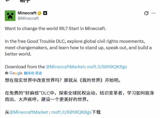 直播吧2月4日讯 《我的世界》(Minecraft)官方通过 X 平台发布公告,宣布推出免费 DLC “Good Trouble”,旨在纪念黑人历史月,让玩家通过游戏了解全球民权运动及相关历史人物;