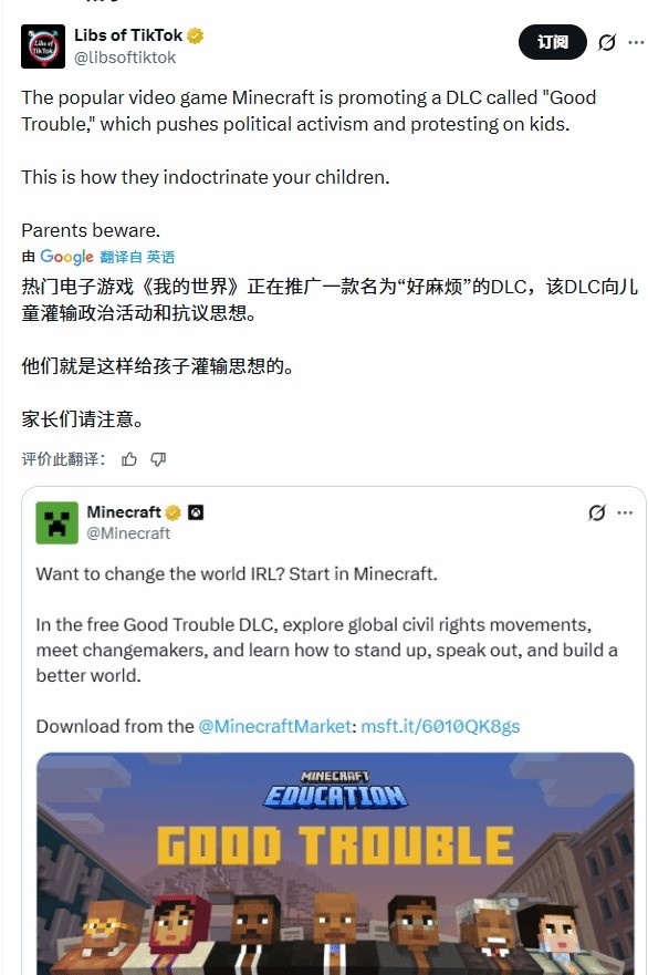 知名游戏主播 Syndicate 转发该公告并质疑 “这到底是什么鬼”,单条转发就带来 480 万浏览量,进一步放大了争议;账号 Libs of TikTok 更是发帖指责,称 Minecraft“向儿童推行政治激进主义和抗议活动,这是在灌输孩子”,该帖子浏览量超 25.4 万,引发更多人跟风质疑。
