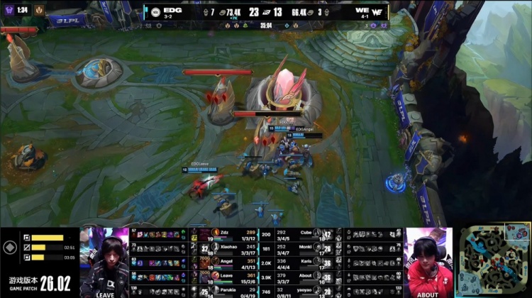 中期大龙团一个假眼引发团战,Leave韦鲁斯爆轰三杀,EDG拿到大龙。紧接着小龙团Karis阿萝拉进场就被Leave秒杀,xiaohao抢掉小龙,但WE经济领先2k。