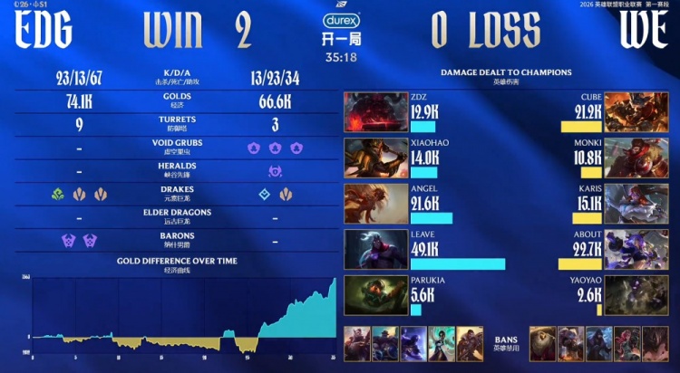 直播吧2月4日讯 2026LPL第一赛段组内赛继续进行,今日首场比赛EDG横扫WE!