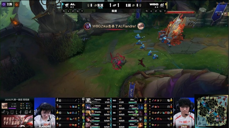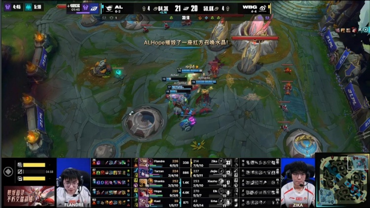 【21:02】下河道团战,xiaohu阿卡丽被王杰女枪扫残送Flandre冥犬人头,WBG下路放出先锋撞掉AL二塔,WBG经济领先6k。