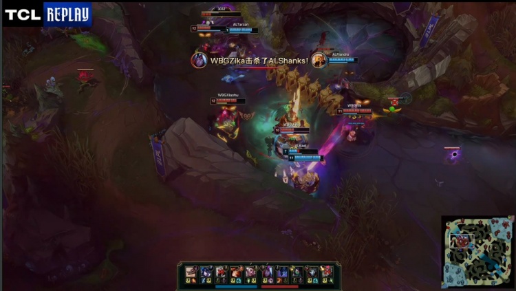 【28:10】中路终极团战,Tarzan小猪扔大集中Eruha,正面Zika被Shanks沙皇推回融化,xiaohu阿卡丽被王杰女枪击杀,AL打出2换5再次团灭WBG,经济反超2k。
