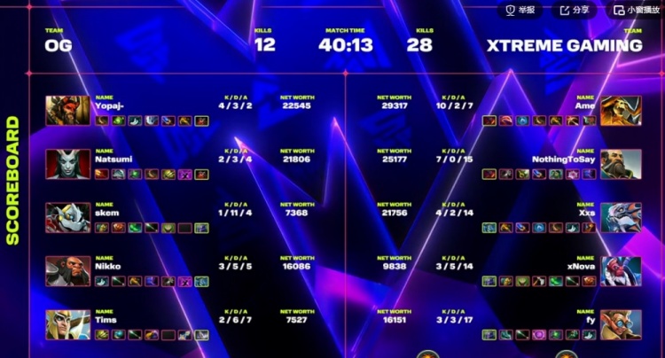 本局比赛OG选了个摇摆的一号位女王+中单兽王,但是前期双方对发育,yopaj兽王除了控了个盾以外啥事不做,20分钟一次大都没用过,XG乐于和你对发育等Ame小骷髅成型!中期Natsumi女王大根团战毫无伤害,XG两波团战大胜之后控盾+魔晶,拉开一万以上经济差之后没给机会,稳健推进结束比赛!拿下自己小组赛的第四胜!