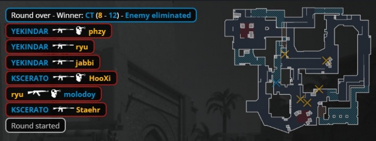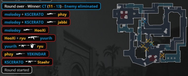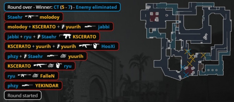 此后狂哥与yuurih齐发力黑豹连拿2分将比分追至4-5。次回合phzy打赢1v2残局拿到第6分,半场结束前A队打B得手,野榜哥Staehr爆轰四杀,A队以7-5结束上半场。