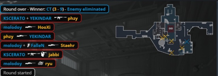 图三Nuke,黑豹赢下拼刀选边先作CT。上半场A队拿下手枪局后连丢3分。回到长枪回合,岳伦联手jabbi打A得手,但yuurih与教父第6回合双人五杀拿到第4分。随后molodoy大狙开轰两回合五杀,让黑豹拿到第6分。第9回合教父回防三杀难赢1v4残局被呼吸终结,A队拿到第3分。此后molodoy大狙又轰三杀,第11回合molodoy外场被phzy沙鹰一发带走,卡神狂哥兜底拿到第8分。最终molodoy大狙再轰三杀,黑豹以9-3结束上半场。
