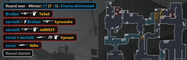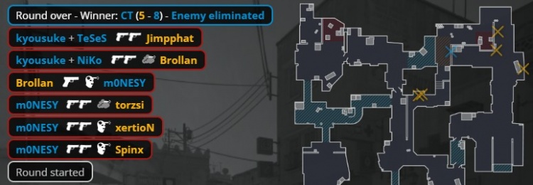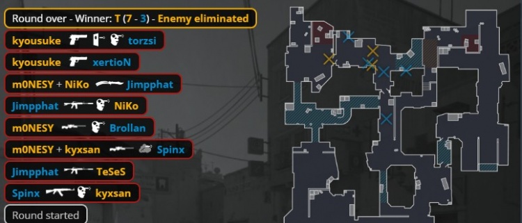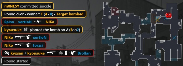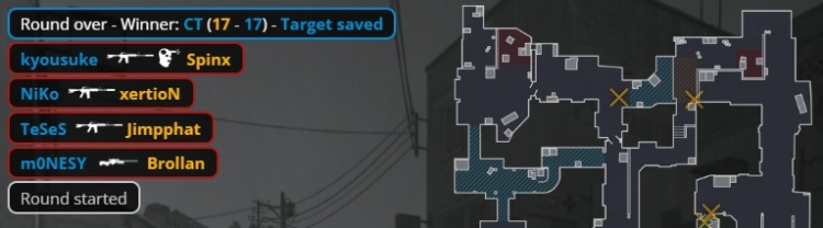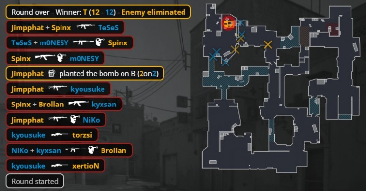 第24回合,京介无甲大狙,孩神拿到Niko的M4,Niko掏出MP5给到K3,自己拿到M4。MOUZ三人中路静音上A小,两人B1出中门,京介大狙B门轰掉出中门的xertion后再杀torzsi,小吉米进B双杀Niko与京介,Spinx打掉K3,残局2v2,小吉米在B下包,Spinx打掉孩神,龙哥残局1v2无力回天,双方12-12进加时赛。