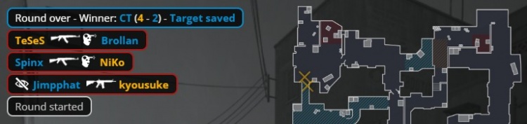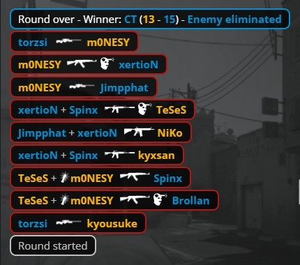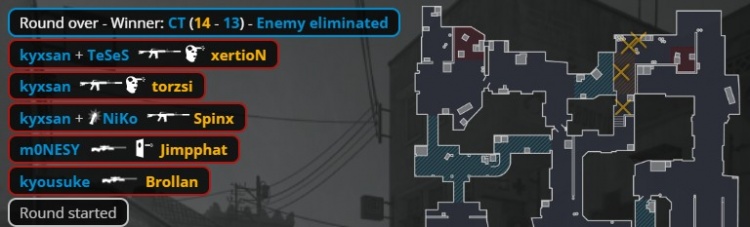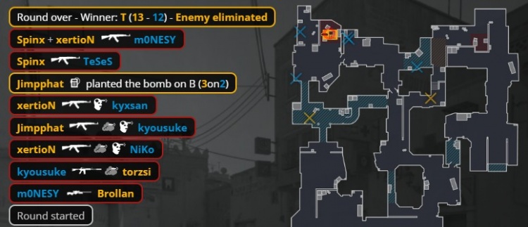 加时赛首回合,孩神大狙A大轰掉Brollan后旋转跳火全身而退,MOUZ带包中门夹B,xertion进B双杀Niko与K3,小吉米轰掉京介后下包,Spinx反摸B1到中门打掉龙哥与孩神,MOUZ拿到第13分。