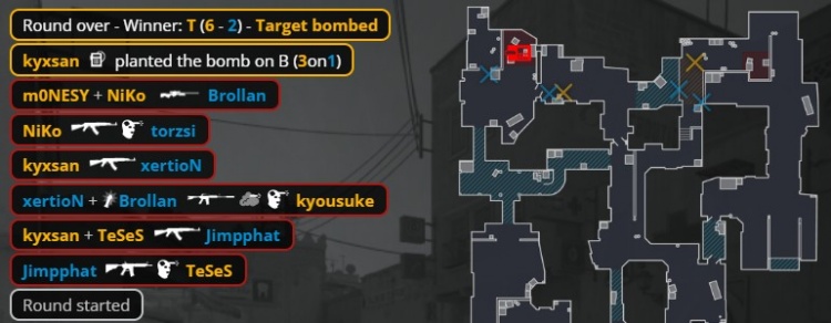第8回合,猎鹰中门夹B,小吉米B大门前换掉龙哥,K3进B双杀,Niko打掉torzsi,孩神大狙断警家打掉Brollan,猎鹰拿到第6分。