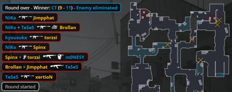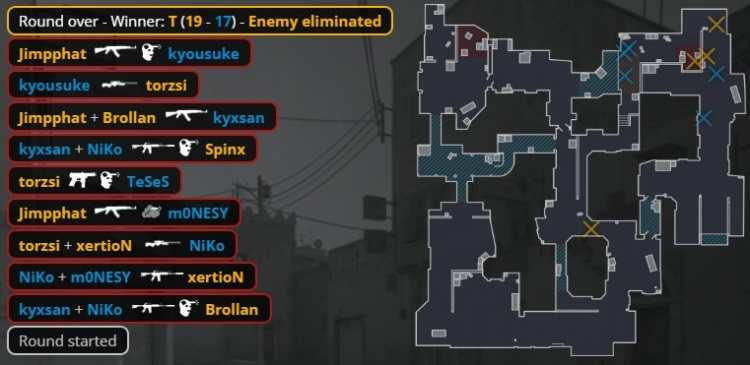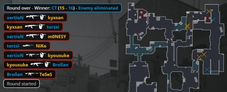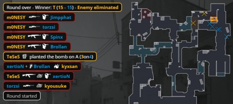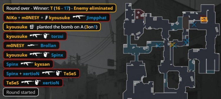 第二个加时赛第3回合,中路刚枪,龙哥换掉xertion,Spinx补掉龙哥与K3拿到双杀,残局3v3,MOUZ放掉B点,孩神大狙夹A小打掉Brollan,京介进A小双杀Spinx与torzsi,Niko补掉小吉米,猎鹰拿到第16分。