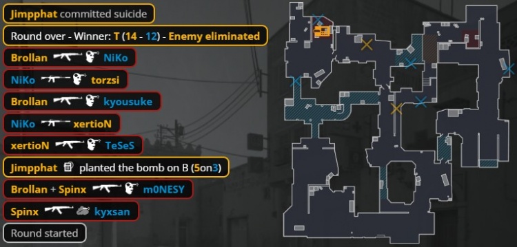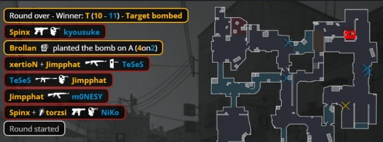 加时赛第2回合猎鹰暂停回来,Spinx先进B洞混掉K3,MOUZ中门爆弹,Brollan进B手撕孩神大狙,小吉米进B下包,xertion中门换掉龙哥,Niko与京介残局2v4保枪未果,MOUZ拿到第14分。