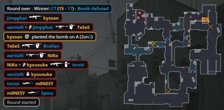 次回合,B1刚枪孩神换掉Spinx,xertion血战到底手雷炸飞京介再杀Niko,龙哥与K3残局2v3,去A下包,龙哥反跑A小打掉Brollan但被xertion打掉,残局K3一打二无力回天,MOUZ拿到第17分。