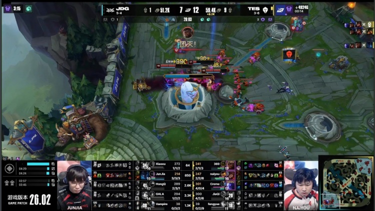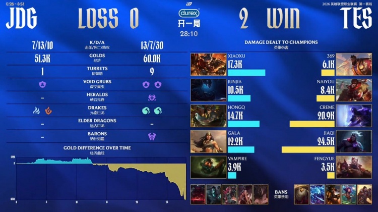 后期大龙团JDG野辅瞬间阵亡,TES轻松拿下大龙,经济领先4k。最终TES中下推进,老9奎桑提带冲上JDG高地,TES强行推平JDG基地赢得比赛胜利。