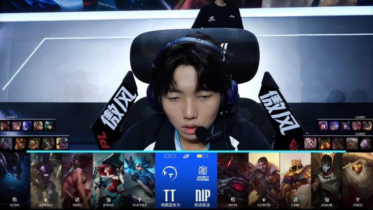 第二局前期Guwon杰斯去下拿到Feather拜年牛头一血,同时Junhao梦魇去上配合Keshi格温越掉HOYA赛恩。双方人头交替上升,Ryan3女枪独自在野区被抓掉点,TT四打五被NIP打出有1换3,Assum烬拿到双杀,NIP吃掉第三条小龙听牌火龙魂,经济领先5k。