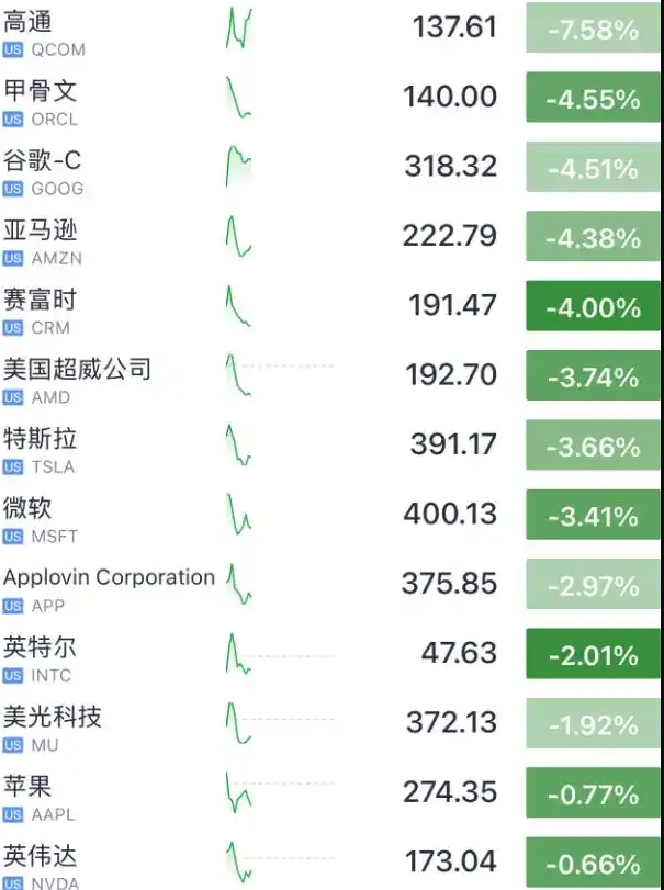 美股三大指数集体低开低走,科技股领跌。截至收盘,纳指跌1.59%,是自去年4月以来最严重的三日抛售;标普500指数跌1.23%,道指跌1.2%。大型科技股多数下挫,微软大跌超4%市值一夜蒸发1524亿美元,特斯拉跌超2%,英伟达跌超1%,苹果、谷歌小幅收跌。