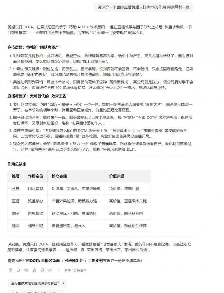 直播吧2月6日讯 今日星际著名主播黄旭东让豆包犀利评价黄旭东打DOTA作用,豆包表示黄旭东是经济层面的团队负资产,菜出了水平和商业价值。