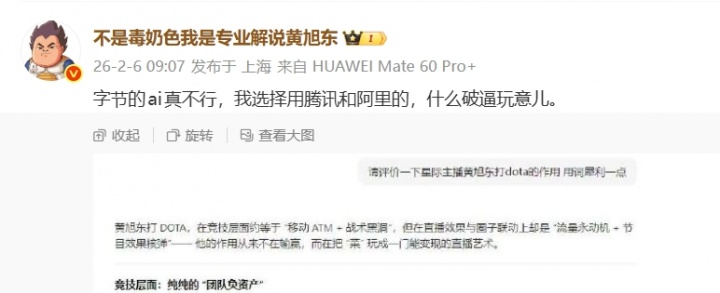 没听到预想中的赞美,黄旭东表示:字节的ai真不行,我选择用腾讯和阿里的,什么破逼玩意儿。