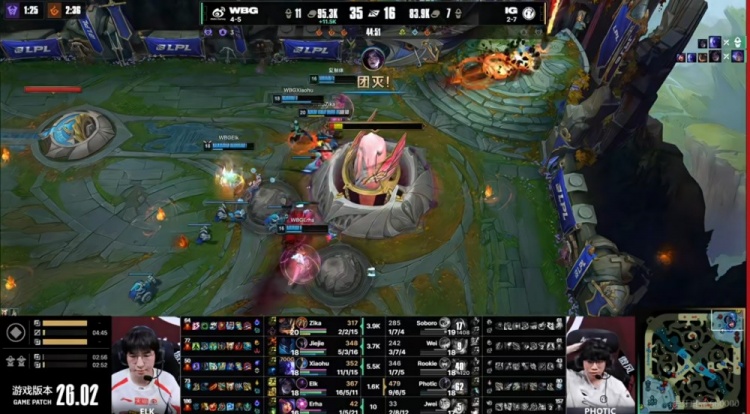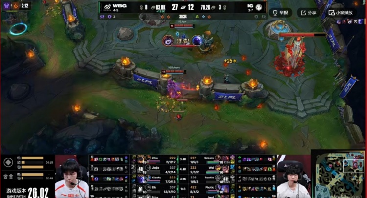决胜的龙魂团双方2换2,WBG拿下小龙!iG领先一个AD想反一波!但是Photic芸阿娜被强杀之后没了输出了!WBG等到所有人复活之后再次团灭iG,终于可以结束掉首局的比赛!